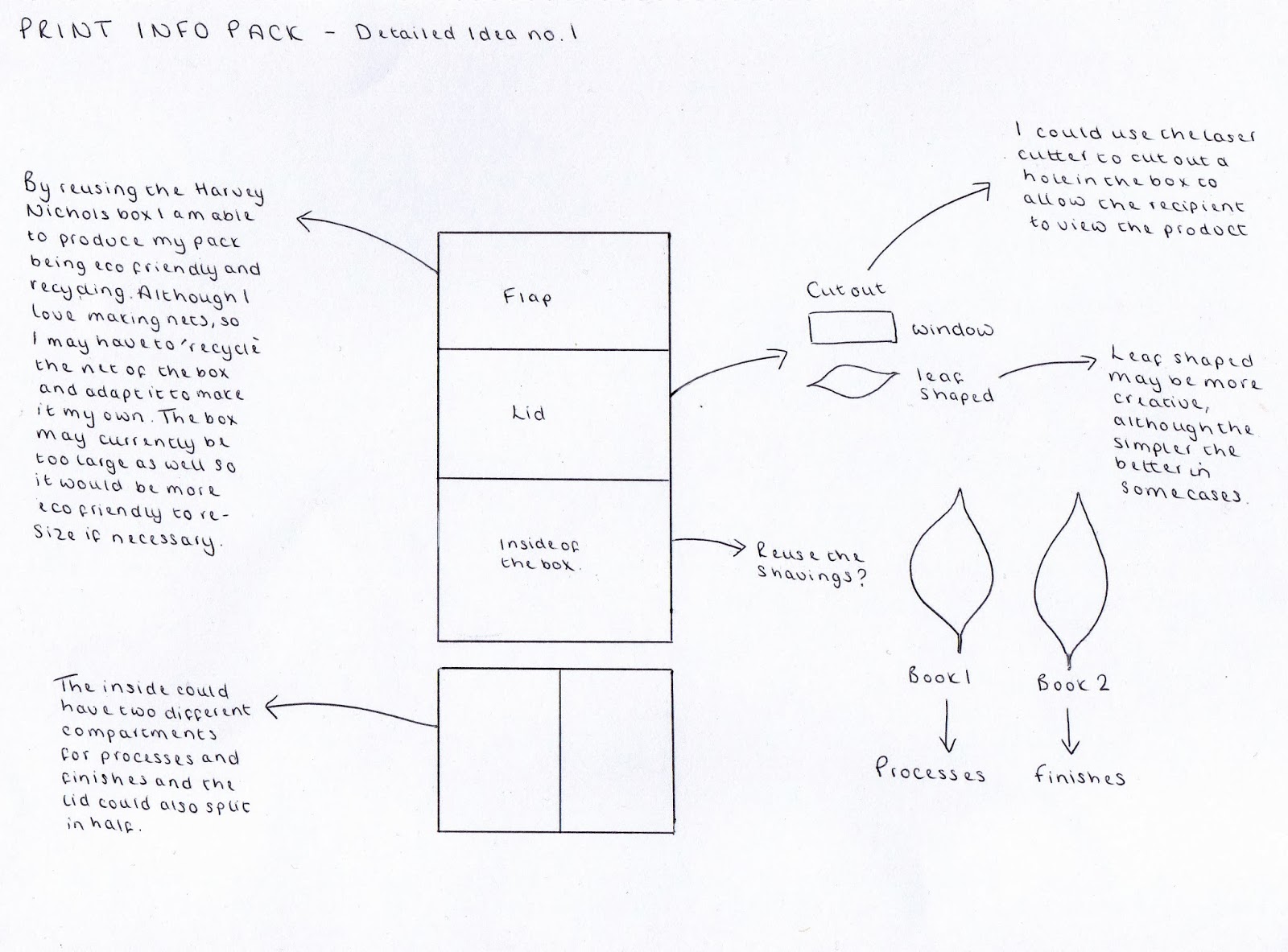 I then decided to draw out an idea enlarged with a bit more detail. Using the Harvey Nichols box and recycling it for this brief, I thought I could produce a book or a set of books which could be placed inside of the box, and create an open window which the user could look through to view the product before opening it up. This would be one way of me being eco friendly, however I am not sure whether the content would justify the size of the box.
