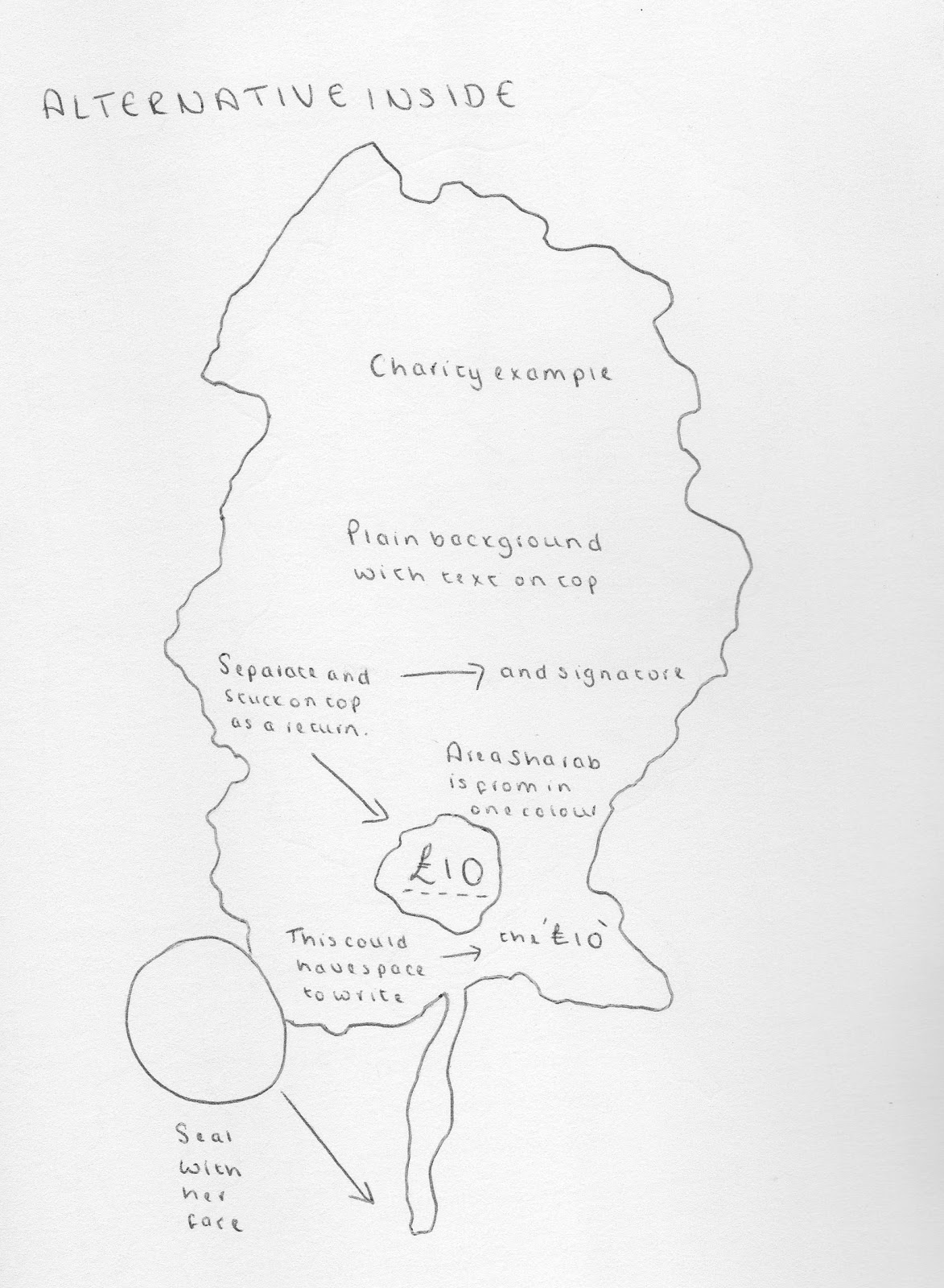 This would take a lot more time and effort to produce and I'm not sure I could complete it to the highest standard possible in the time we have. I considered having a removable tab inside with a space for the recipient to write their amount and signature. As well as this, on the same design, I thought about having a sticker seal too.